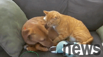 The family members were very surprised when they saw this scene, because they had never seen Kevin clinging to Joule like this at home. They didn't expect that the relationship was so good in private, so why should they keep it secret like an underground affair. Although Kevin was very enthusiastic and kept acting coquettishly on Joule, Joule was still too anxious and did not react much. However, Joule felt much better in the company of the cat. The family feels that Kevin is really like an angel. He not only loves the family but also helps take care of the dogs.