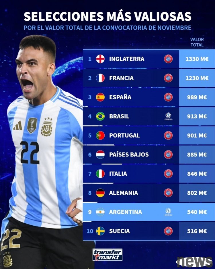 The German transfer market has calculated the value of each national team on the November international match day and listed the list. England, France, and Spain are the top three, and Argentina ranks ninth.