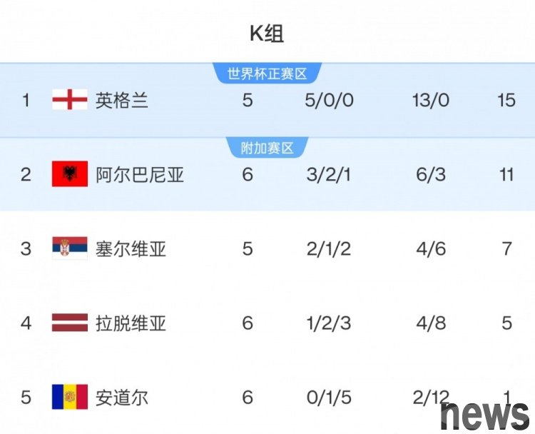In Group K of the European Group Stage of the World Cup Qualifiers, Serbia lost 0-1 at home to Albania and suffered two consecutive defeats. As a result, England basically secured the first place in the group to advance to the World Cup, while Serbia needs to compete with Albania for a play-off spot.