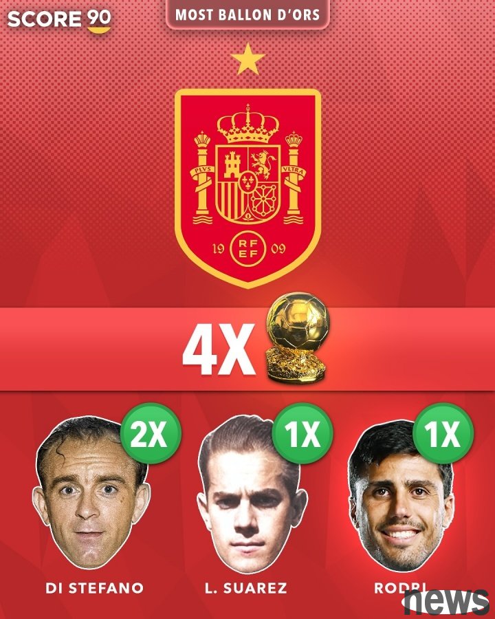 9. Spain 4 times (Di Stefano, Suarez, Rodri x1)