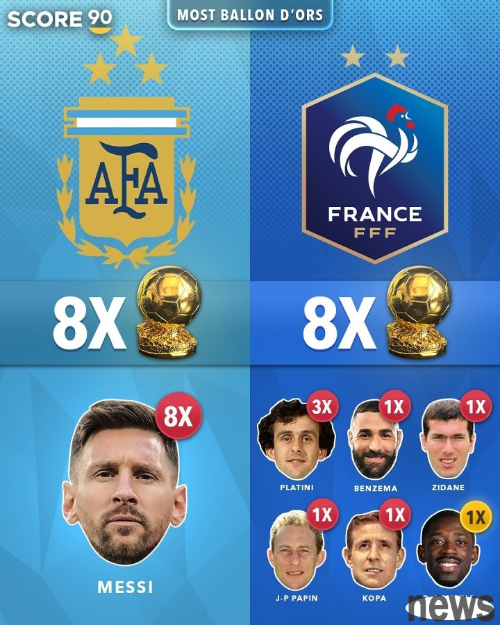 Dembele won the 2025 Golden Ball Award, and French players also tied Argentine players with 8 awards. According to score90 statistics, France and Argentina are the countries with the most players won the Golden Ball Award, both 8 times.