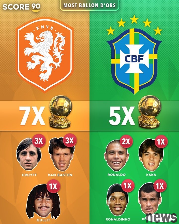 3. Netherlands 7 times (Cruyff, Van Basten x3 Gulit x1)