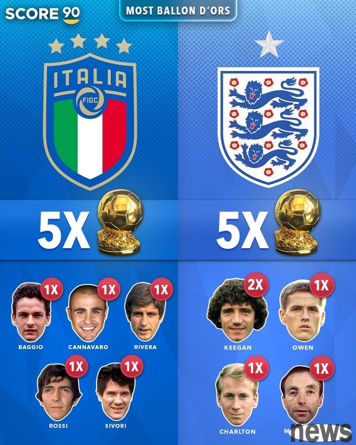 6. Italy 5 times (Baggio, Cannavaro, Rivera, Rossi, Sivori x1)