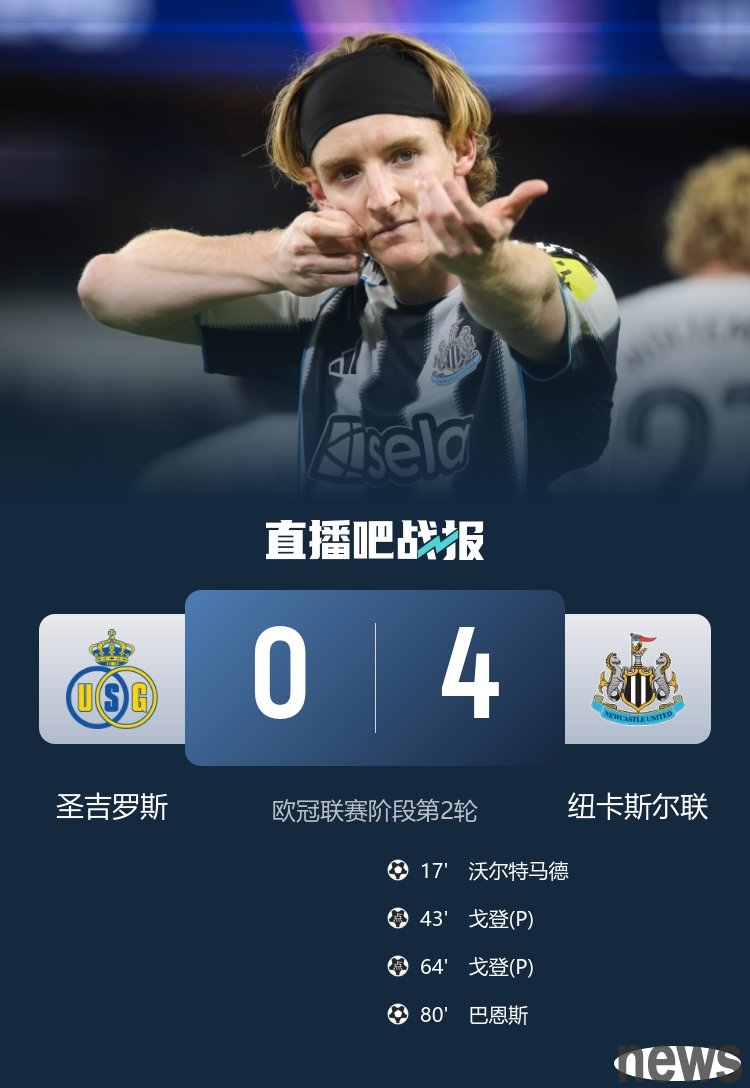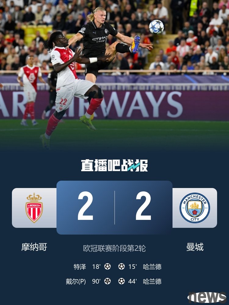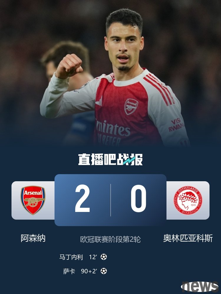 Today's Champions League, Arsenal 2-0 Olympiacos, Manchester City tied 2-2 by Monaco, and Newcastle defeated San Giros 4-0.