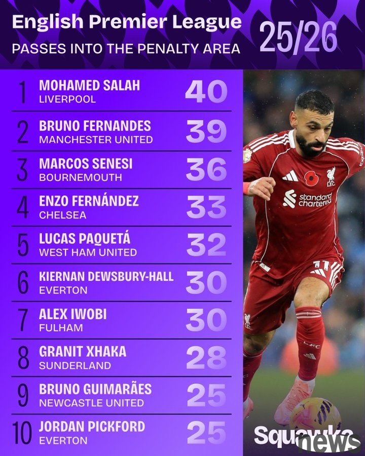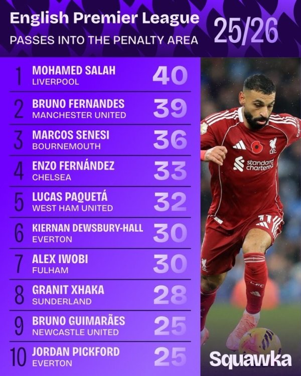 The Premier League has gone on for 11 rounds. Squakwa also counted the number of passes into the penalty area in the Premier League this season. Salah topped B Fee.